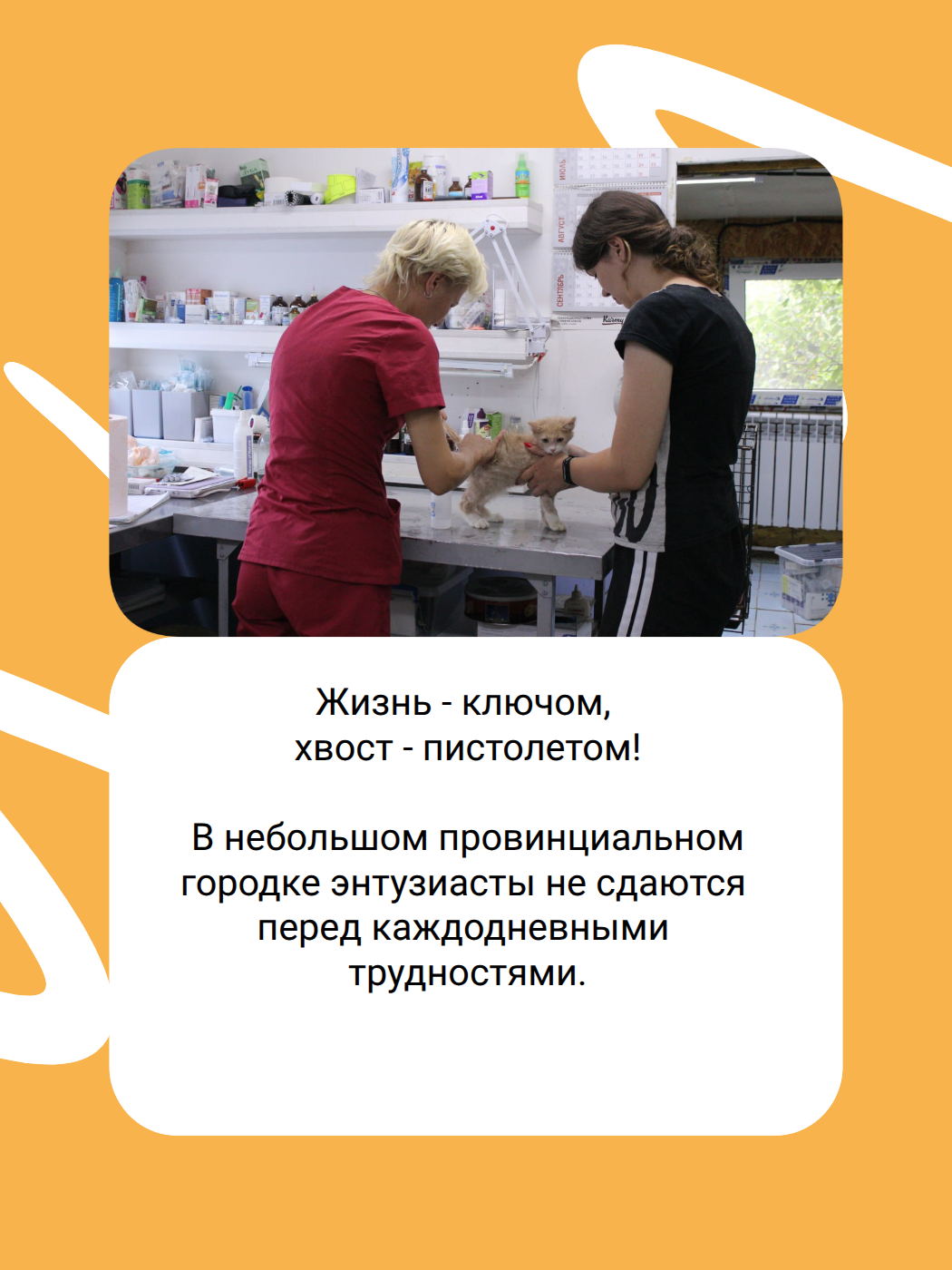 Небольшая команда энтузиастов - обычных людей. Мы стремимся к открытости и прозрачности. Нашему директору может позвонить любой человек, которому требуется помощь с животным.