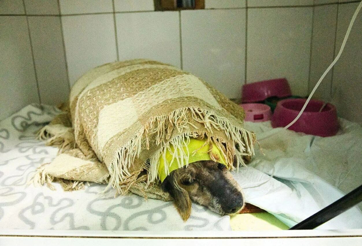 Первые дни Бобик был в стабильно тяжелом состоянии, ему было плохо, он лежал и не вставал. Не сразу, но он все же начал вставать, кушать, медленно делать несколько шагов, чтобы потом снова закопаться в своё покрывальце.