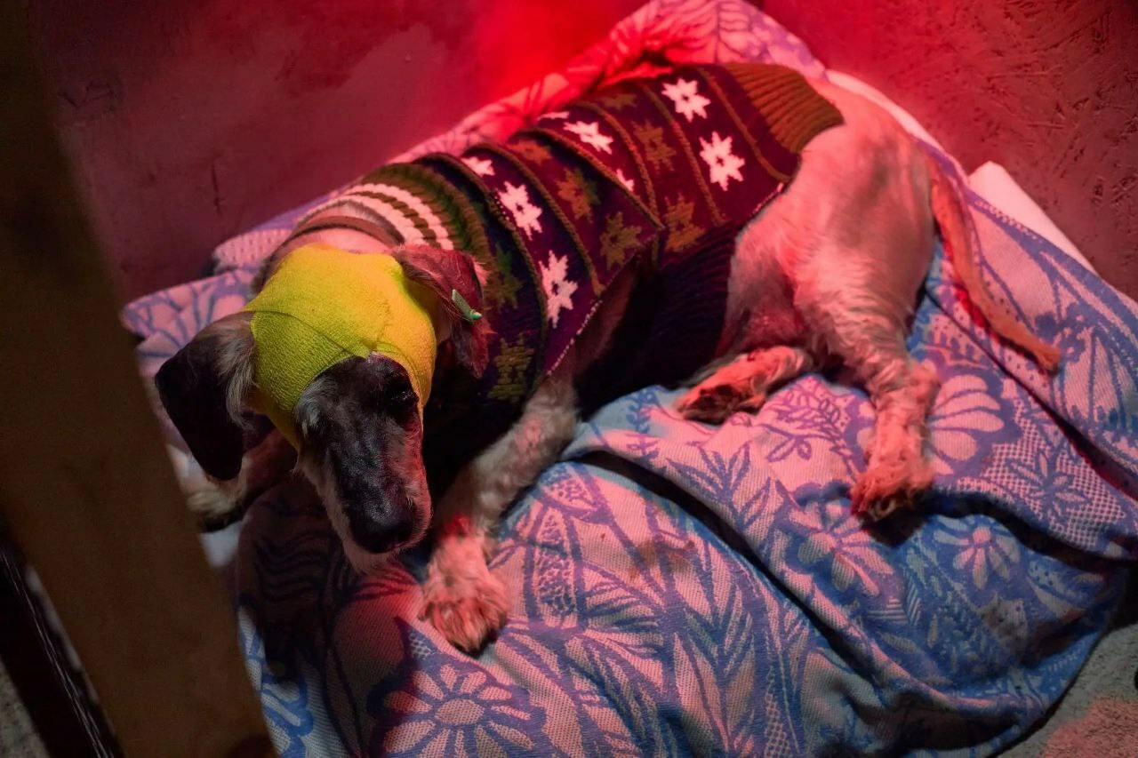 Поскольку песика побрили, чтобы можно было его вылечить, то теперь он ходит в кофточке и спит под обогревающей лампой, чтобы не мерзнуть.